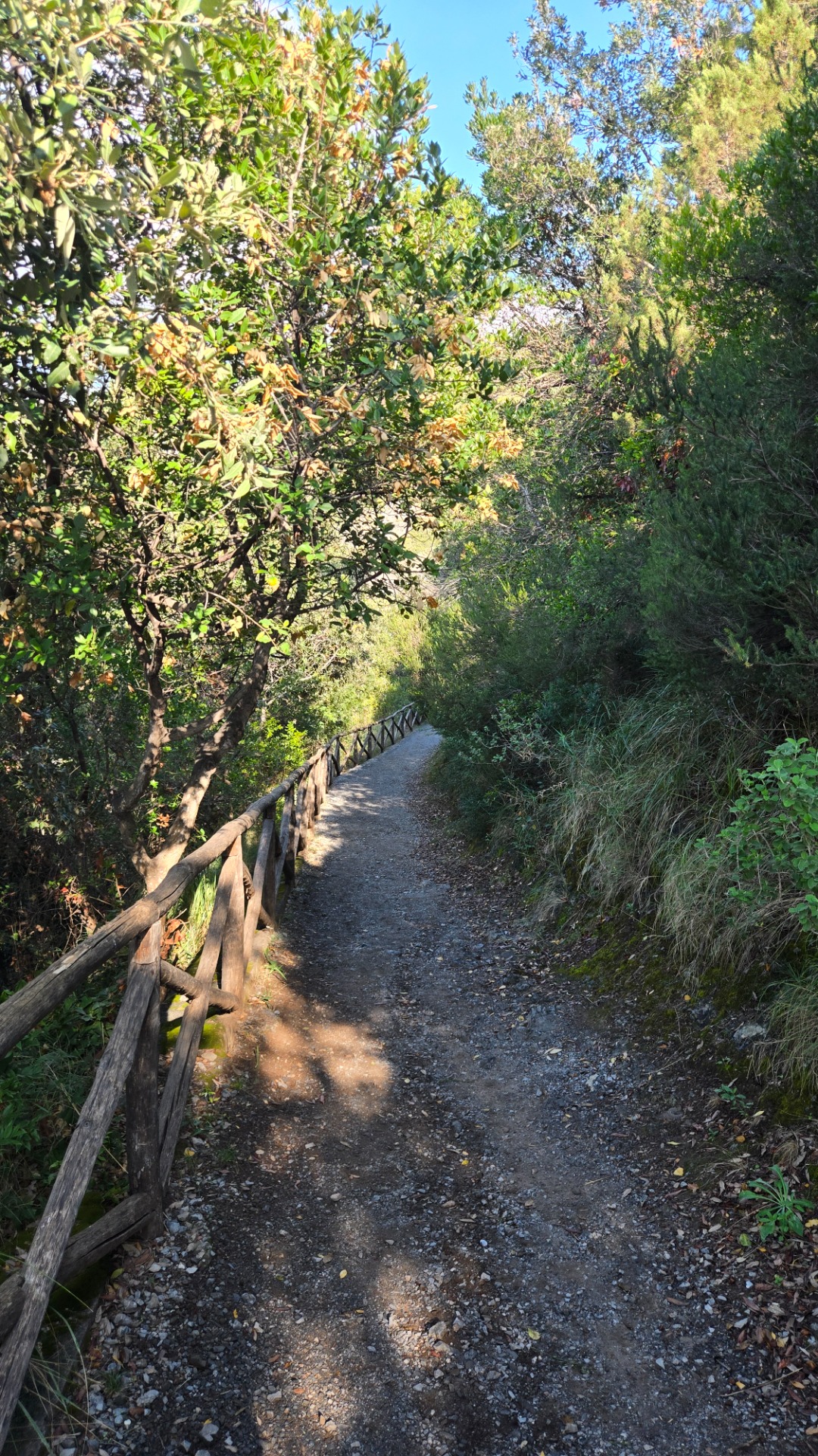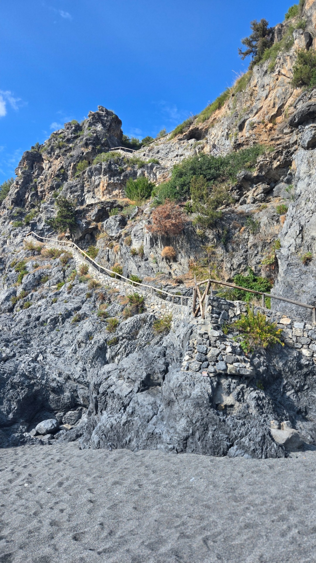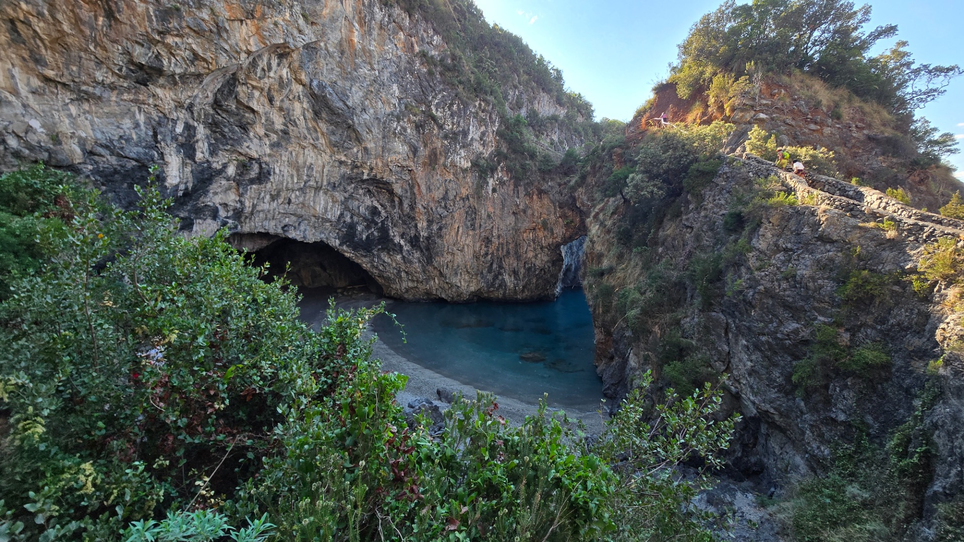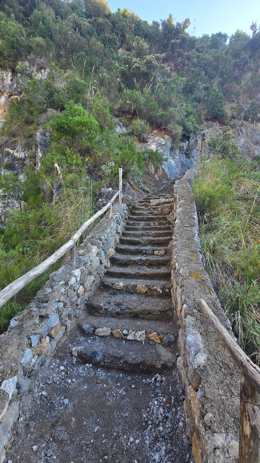 You can walk down to the sea or drive almost to the beach, but be prepared for the fact that in the season, it's lively here and parking can be a bit of a lottery. We were here in October and still worked up quite a sweat tackling the stairs and the access path in general. I even heard Dita utter some stronger words directed at Italian safety and visitor infrastructure in general, summed up in a few telling, untranslatable expressions. I absolutely do not recommend it with small children. The stairs are natural, so they're slippery, and there's not much to hold onto – but at the end, a well-deserved reward awaits you.**