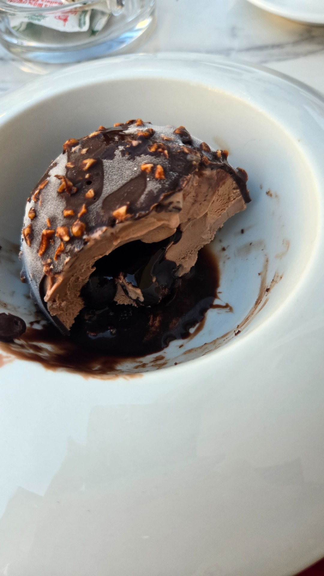 A pak truffa. To je místní zmrzlinová specialita – vypadá jako větší kulatá "kulička", většinou čokoládová nebo lískovo-oříšková, posypaná kakaem. Uvnitř bývá tekuté nebo měkčí čokoládové čokoládové srdíčko, které se ti při nakrojení pěkně rozteče. Servírují ji v mističce nebo na talířku, jí se lžičkou a je to přesně ten dezert, který si dáš "jen na ochutnání" a pak bys nejradši druhou.